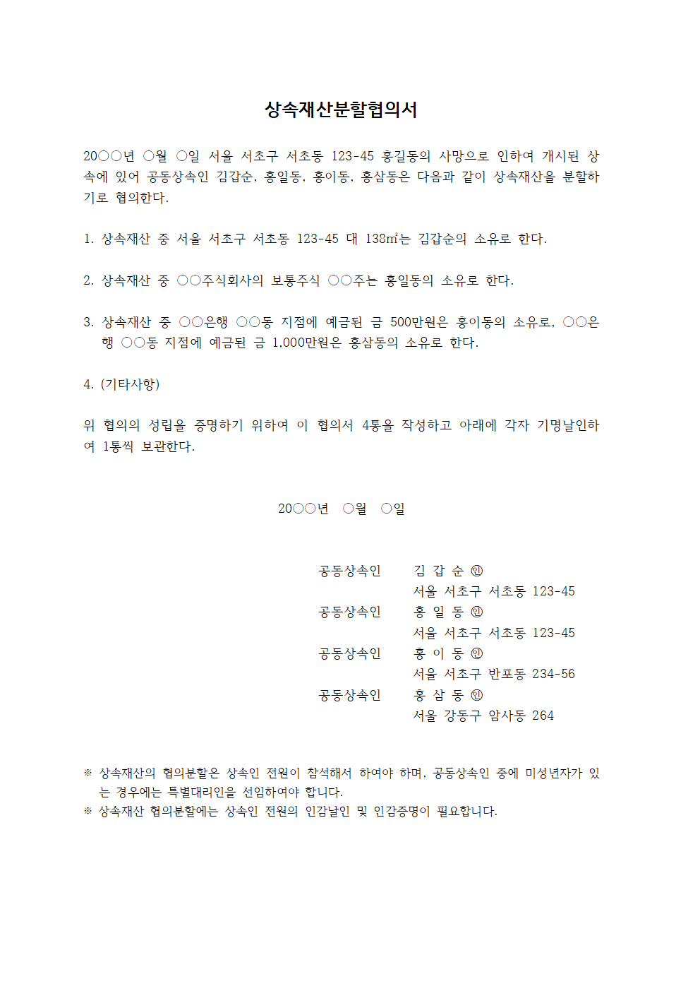유언이 없는 때에는 상속인들간에 서로 협의하여 상속재산을 분할할 수 있으며, 분할이 서로 협의가 되면 상속재산분할협의서를 작성하고 인감증명을 첨부하여야 합니다.