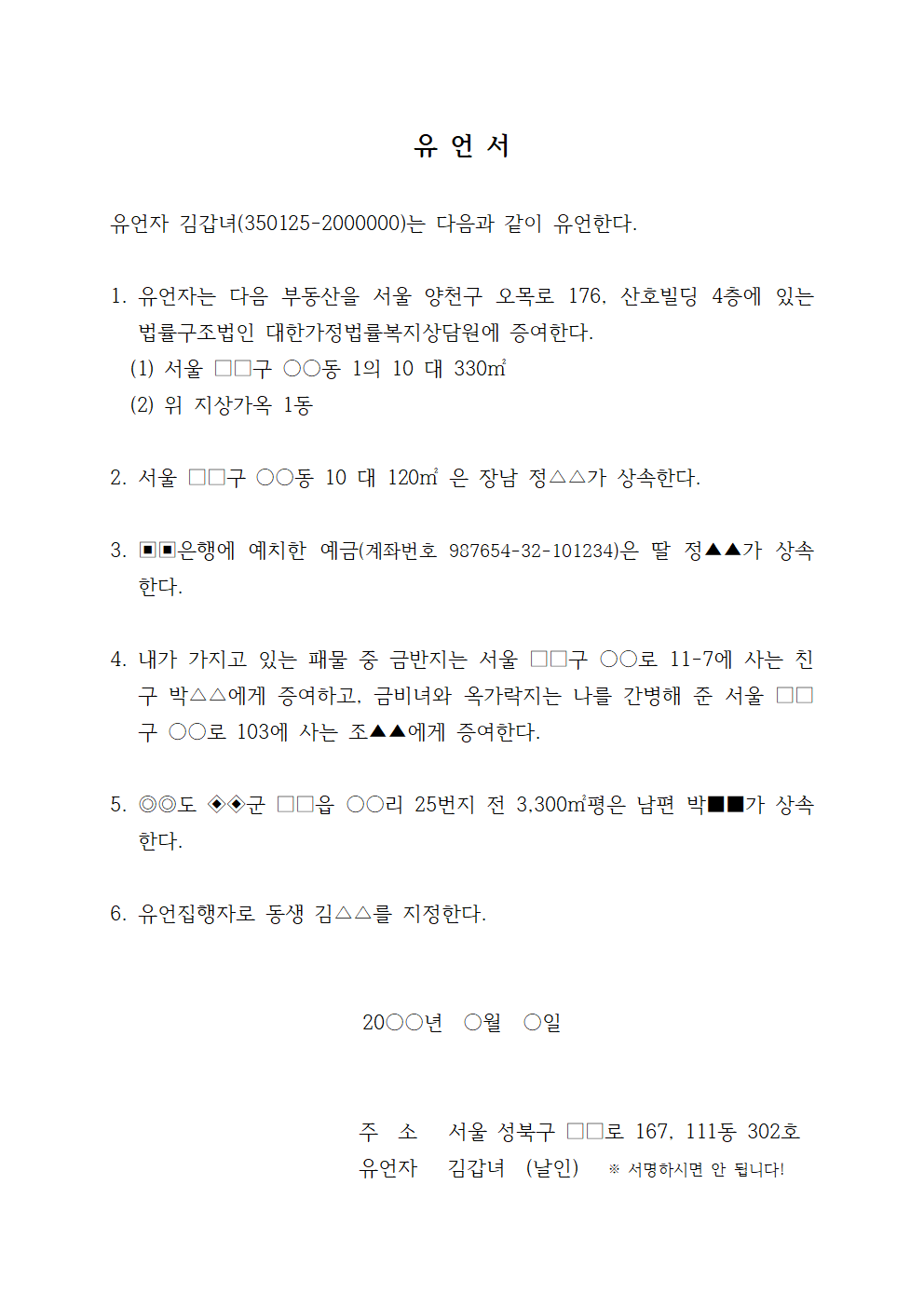 그리고 성명도 그 유언서가 누구의 것인가를 알 수 있는 정도면 되므로 호나 자 또는 예명 등을 사용해도 좋습니다. 단 이런 것을 고무도장 등에